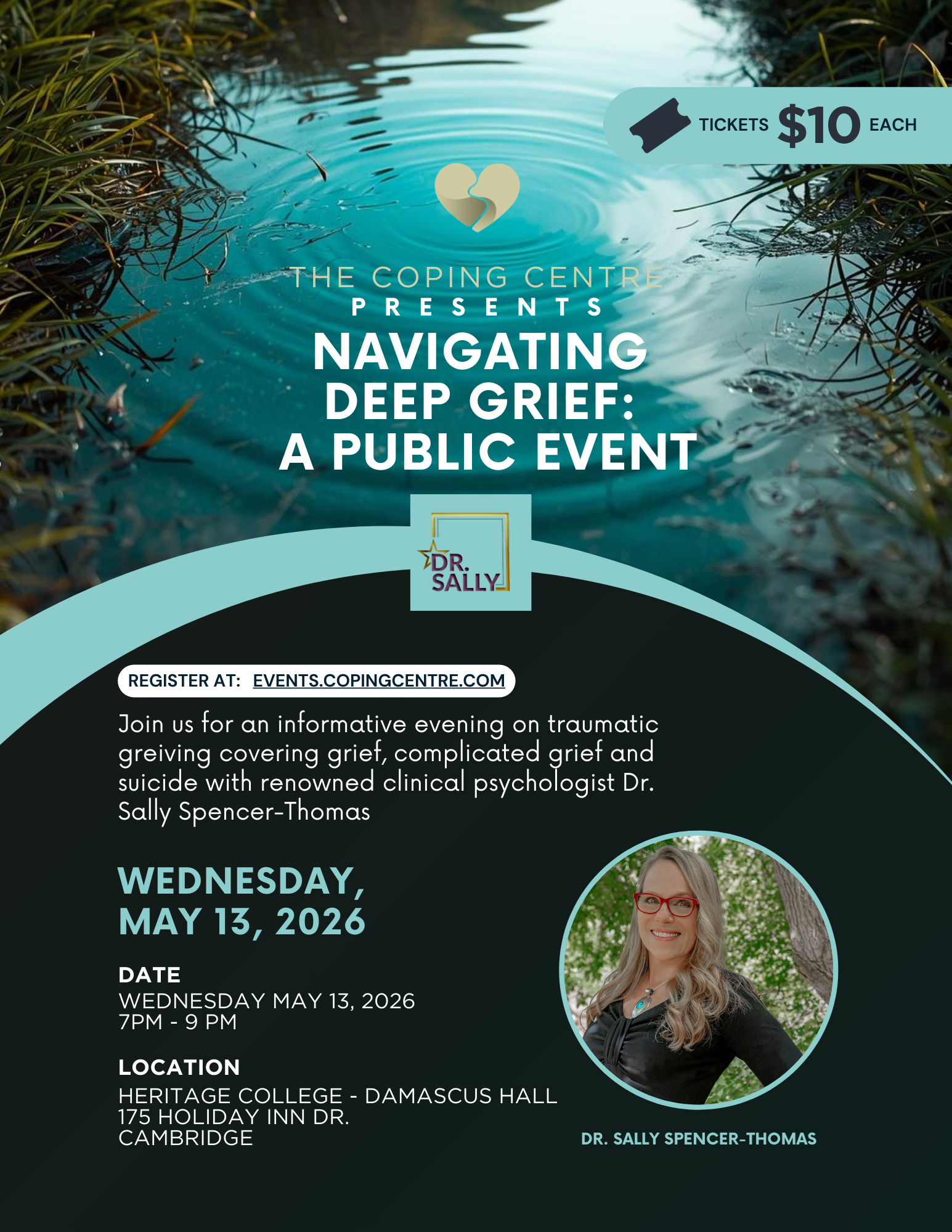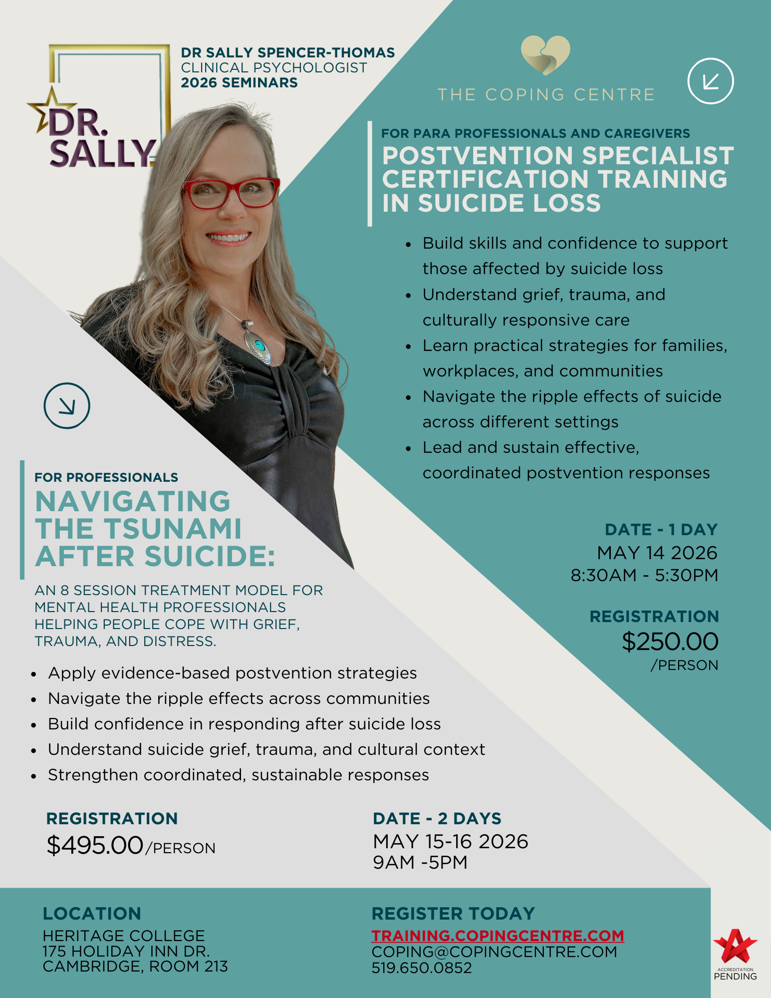 Professionals are invited to join them for a two-day seminar from May 15-16, 2026 from 9am-5pm titled Navigating the Tsunami After Suicide: An eight-session treatment model for mental health professionals helping people cope with grief, trauma, and distress. This will be held at Heritage College in Room 213. Registration is $495 per person and you can register at training.copingcentre.com .