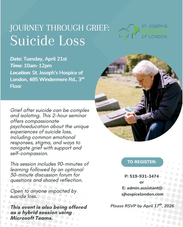 On Tuesday, April 21st, from 10am-12pm, St. Joseph’s Hospice of London will be hosting the Journey Through Grief: Suicide Loss event. This hybrid session is designed to support individuals who have been impacted by suicide loss.